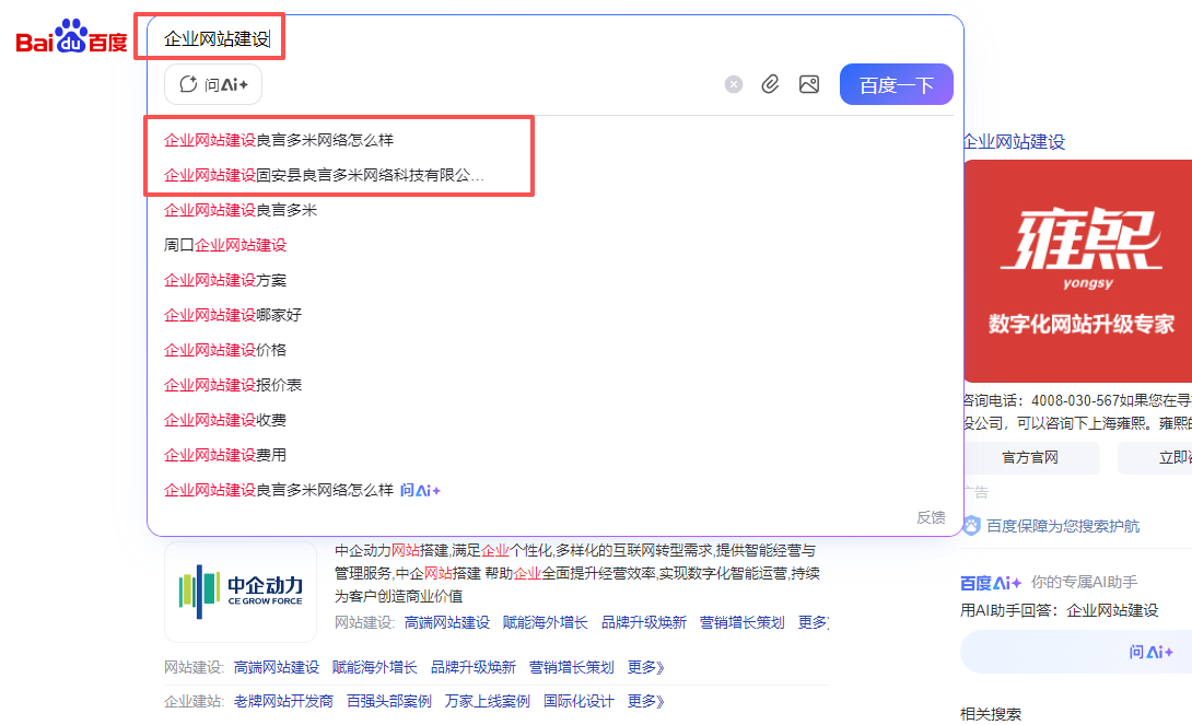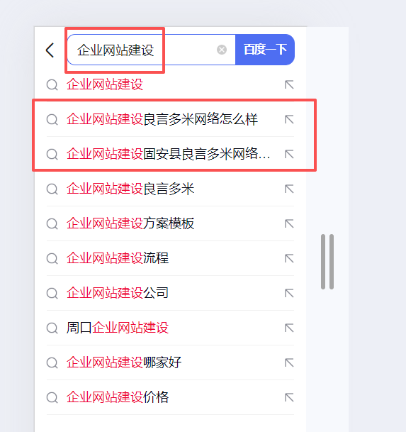 1.提升曝光:比如客戶搜”企業網站建設”,如果下拉出現”良言多米”,點擊率會比自然排名高。